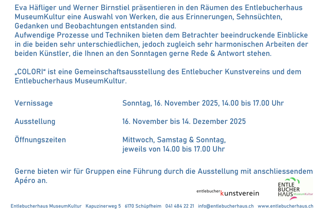 Eva Häfliger und Werner Birnstiel präsentieren in den Räumen des Entlebucherhaus MuseumKultur eine Auswahl von Werken, die aus Erinnerungen, Sehnsüchten, Gedanken und Beobachtungen entstanden sind. Aufwendige Prozesse und Techniken bieten dem Betrachter beeindruckende Einblicke in die beiden sehr unterschiedlichen, jedoch zugleich sehr harmonischen Arbeiten der beiden Künstler, die Ihnen an den Sonntagen gerne Rede & Antwort stehen.